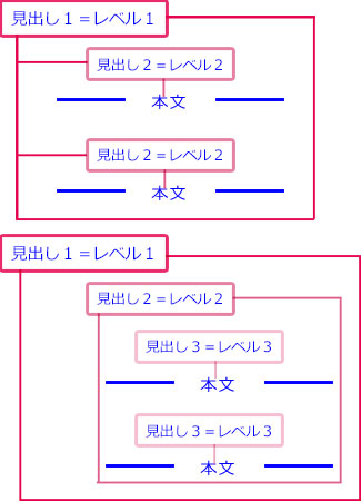 ( くれぐれもH2の後にH4が来たり、H3の下の小見出しにH2をつけたりしないように気を付けてください。)